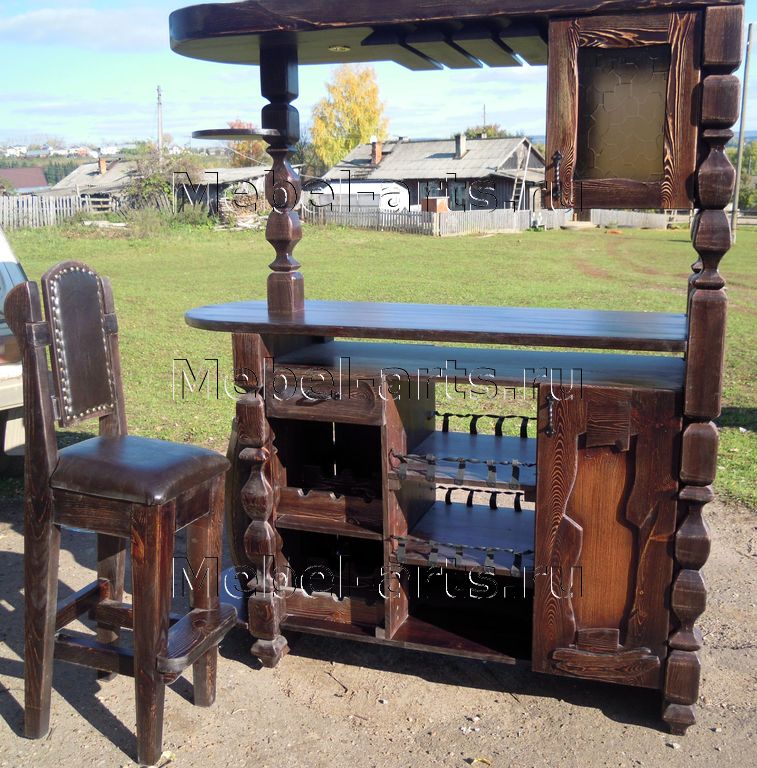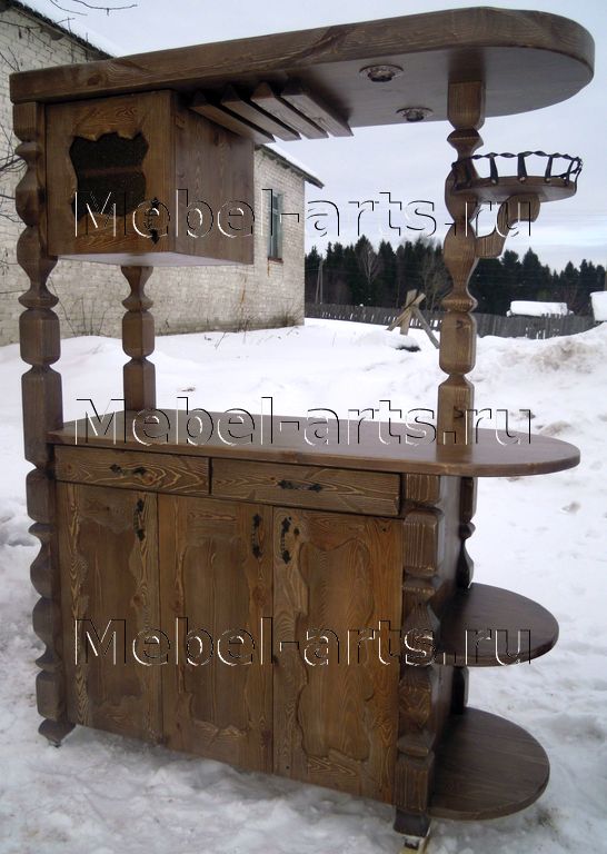 Деревянная стойка под старину выполнена из массива сосны и отличается хорошо выделенной текстурой дерева. Эта барная стойка замечательно выглядит в интерьере бара, оформленного под старину. Особенно хороша такая небольшая стойка в помещении довольно скромных размеров. Кстати, стойка со шкафчиками — подходящая мебель не только для баров и кафе, но и для кухни (конечно, только если кухня — под старину). Если кухня совсем небольшая или вы любите простор и не хотите слишком заставлять помешение мебелью, то обратите внимание на деревянный буфет под старину из сосны. Площадь он занимает небольшую, однако вместительный и красивый. Массивная мебель под старину обладает неповторимым колоритом, создает атмосферу надежности и основательности.