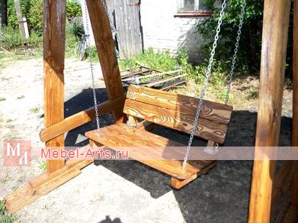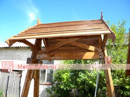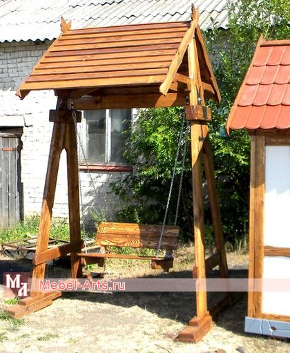 Высокая садовая качель из искусственно состаренного массива сосны с коваными элементами. Сиденье качели — на цепях. Качель имеет двускатную деревянную крышу.