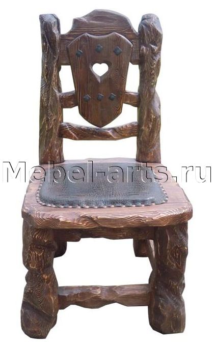Стул из массива дерева – надежный и крепкий. Он сделан из натуральной сосны, фактура которой подчеркнута брашированием и тонировкой. Он выглядит нарочито грубым, ножки, спинка и сидение – неровные, но все неровности тщательно отшлифованы, а значит, сидеть на нем удобно. Сидение комбинированное – с мягкой серединой, обитой кожей с декоративными гвоздиками. спинка – деревянная, с декоративным щитом, в котором вырезан значок карточной масти.