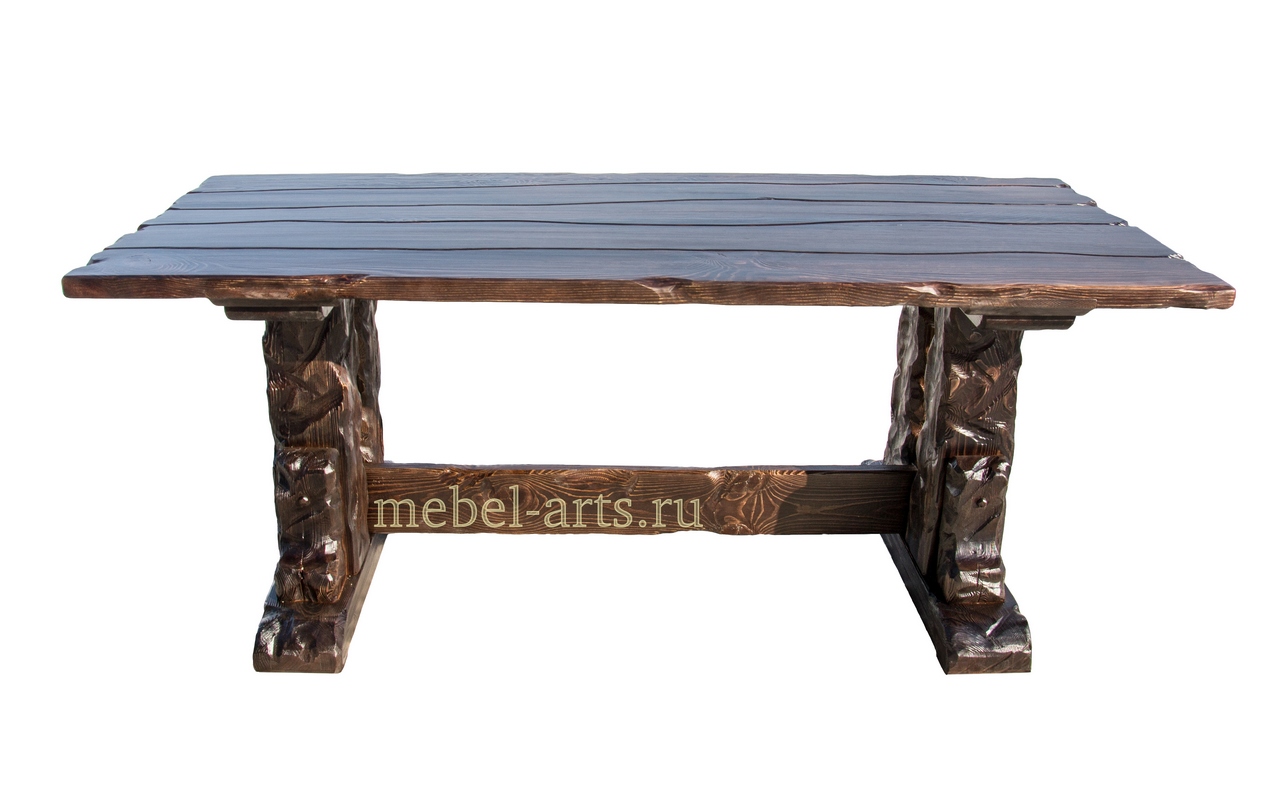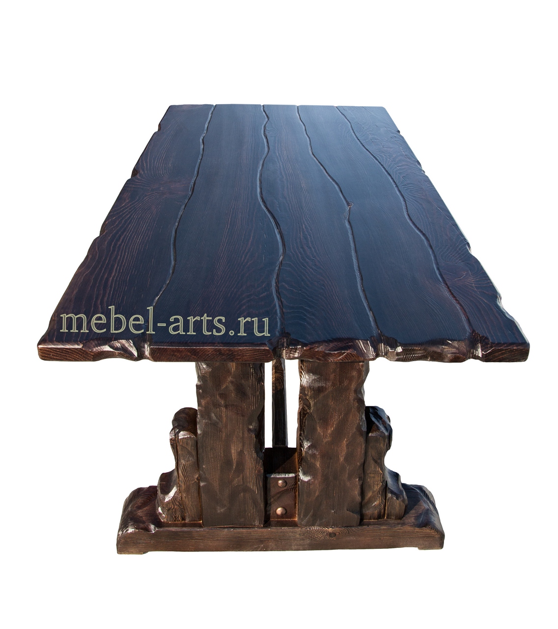 Стол из массива под старину смотрится очень оригинально. Столешница будто собрана из неровных, грубо обработанных досок. На торцах сколы и вмятины, стол кажется действительно старинным и имеющим богатую историю. При этом столешница тщательно отполирована, она гладкая и приятная на ощупь. У этого стола из массива под старину на заказ две опоры, соединенные перекладиной. Они крепкие и надежные, а значит, купить стол из массива можно не только для домашнего использования, но и для кафе или ресторана.