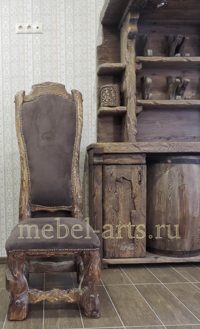 Мы предлагаем заказать стул с эксклюзивным дизайном. Он выполнен из массива сосны, нарочито грубо обработан, поверхность состарена, натуральный рисунок древесины подчеркнут искусной обработкой. Он стоит на крепких ножках, соединенных проножками, а значит, выдержит любой вес и условия эксплуатации. Мягкое сидение и спинка обиты кожей при помощи декоративных металлических гвоздиков. Этот стул выглядит так, будто имеет многолетнюю и даже многовековую историю. При этом он обработан качественным лаком, что позволит использовать его в течение ещё многих десятилетий.